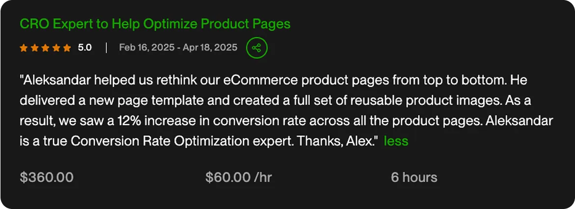 High-impact, flexible. You get the kind of CRO/UX/UI work that usually comes with a big retainer, but without long-term lock-ins.